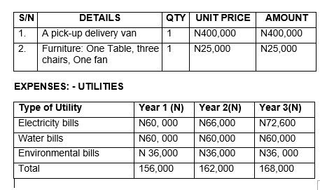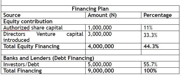 - The Owner (Mr. AB Merchant) will acquire N5,000,000 of debt funds and personal equity contribution of N3,000,000. In addition to the N1,000,000 authorized share capital fully subscribed, to grow and develop the business.