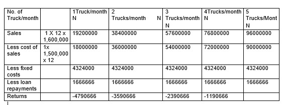 - Because most of the fixed costs are due towards the year end, the company can increase its turnover and earnings above 5 trucks a week for 52 weeks in the year without incurring further costs.