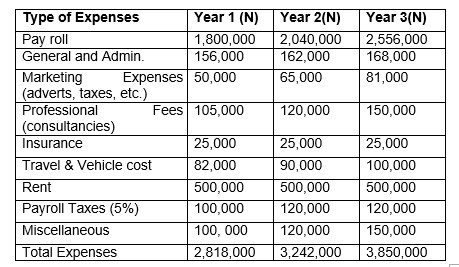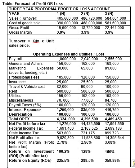 By the end of the first year the expected net profit/ earnings from sales before tax is N11,276,000 while net profit/earning after tax is N9,020,800, giving a 100.2% returns on investment (ROI) and 225.5% return on Equity (ROE). It is also expected to grow by 20% in subsequent years. This is shown by the expected earnings for the second year which gives N14,423,500 profit before tax and N 11,538,800 profit after tax generating 128% ROI and 228.5% ROE respectively.